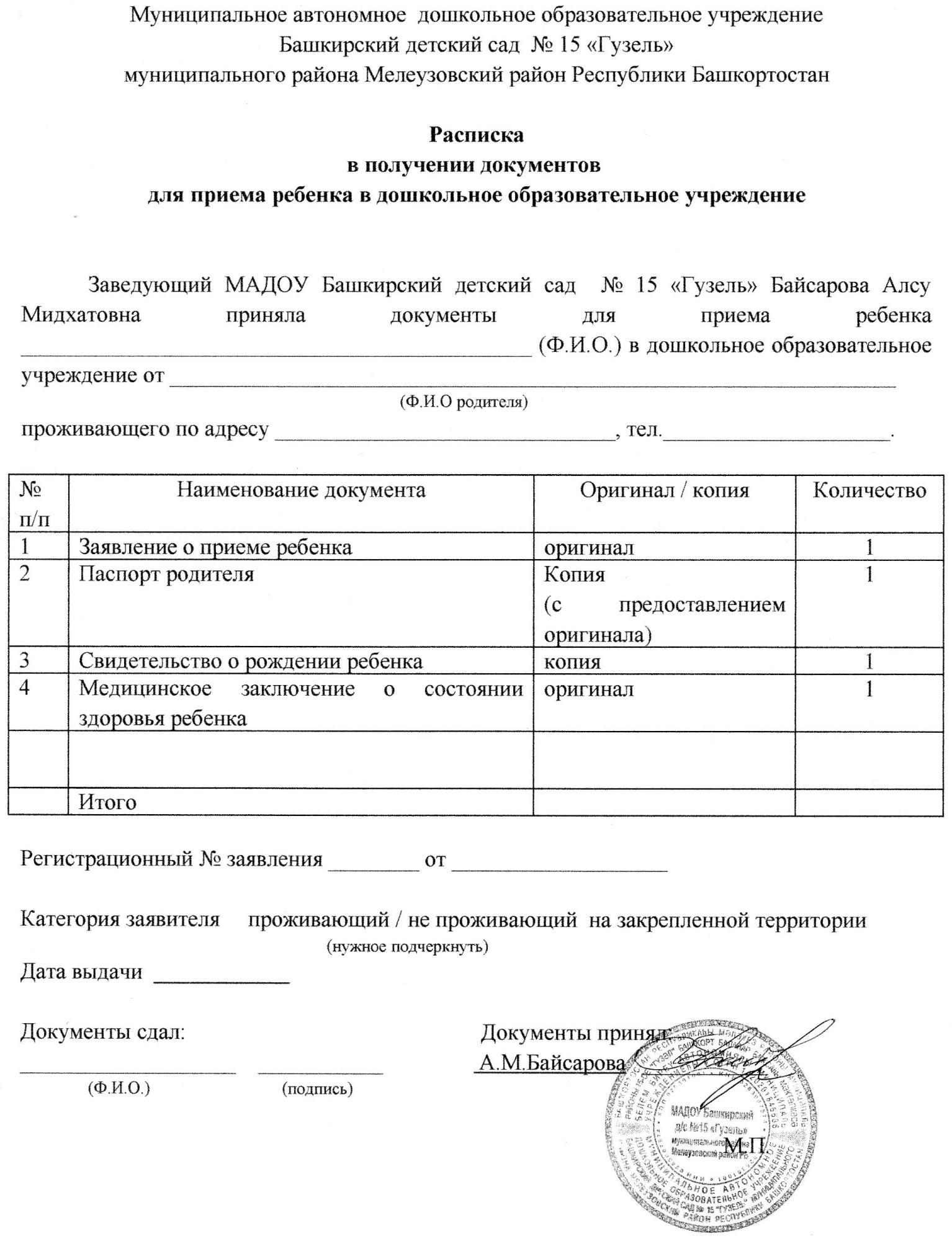 1. Документы о приеме подаются в МАДОУ вместе с направлением, выданным МКУ Управление образования МР Мелеузовский район РБ, в течение 15 календарных дней со дня выдачи.